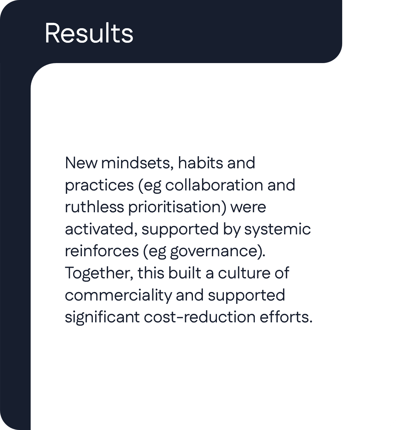 The workstream went red to green in two months, with the change effort recognised as the best the organisation had seen in a decade.