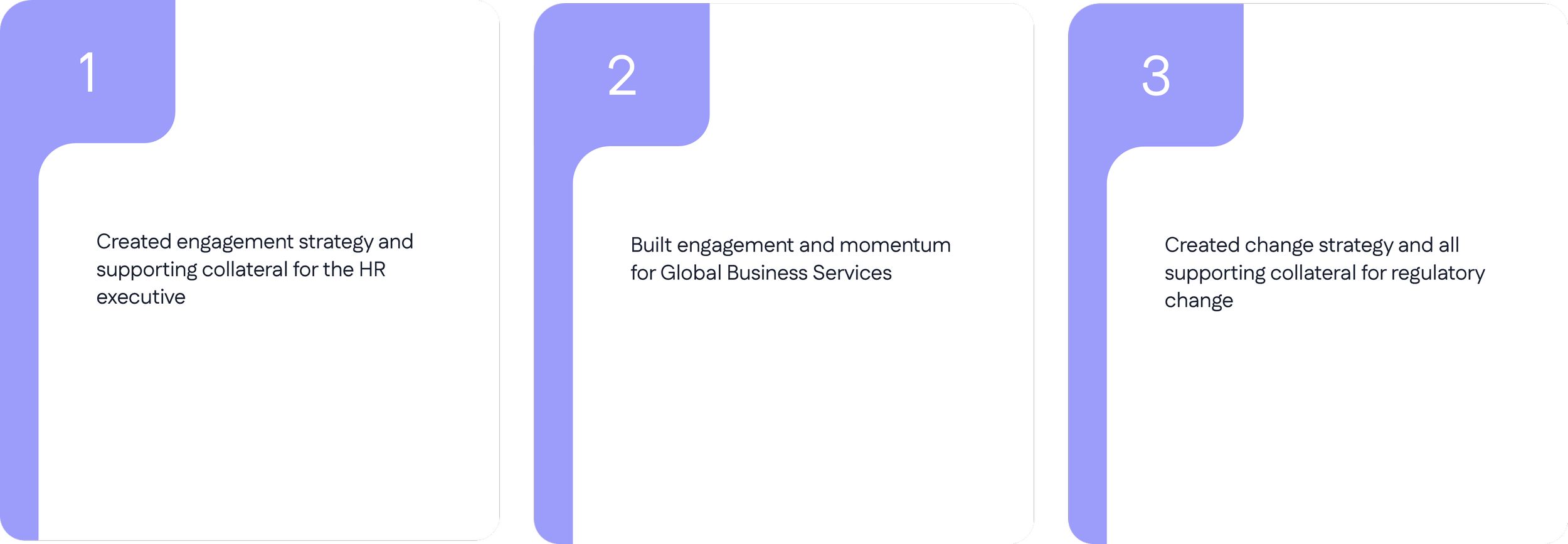 A Chief People Officer was leading her team through a portfolio of transformation – structural, cultural, regulatory and digital. OneStep provided a dedicated change team to both design and deliver the change management required for programmatic change, and coach and support the HR executive team on how to lead their teams through change.