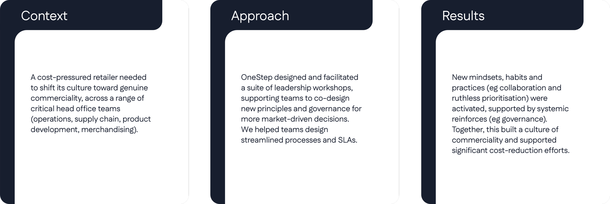 A fast-growing Partner team was navigating turbulent times – absorbing market shifts, challenging team dynamics and increasing sales and cost pressures. OneStep supported with a blend of team interventions and 1:2:1 executive coaching, helping Partners improve sales skills, evolve people leadership approaches and reset how they collaborated and supported team outcomes.